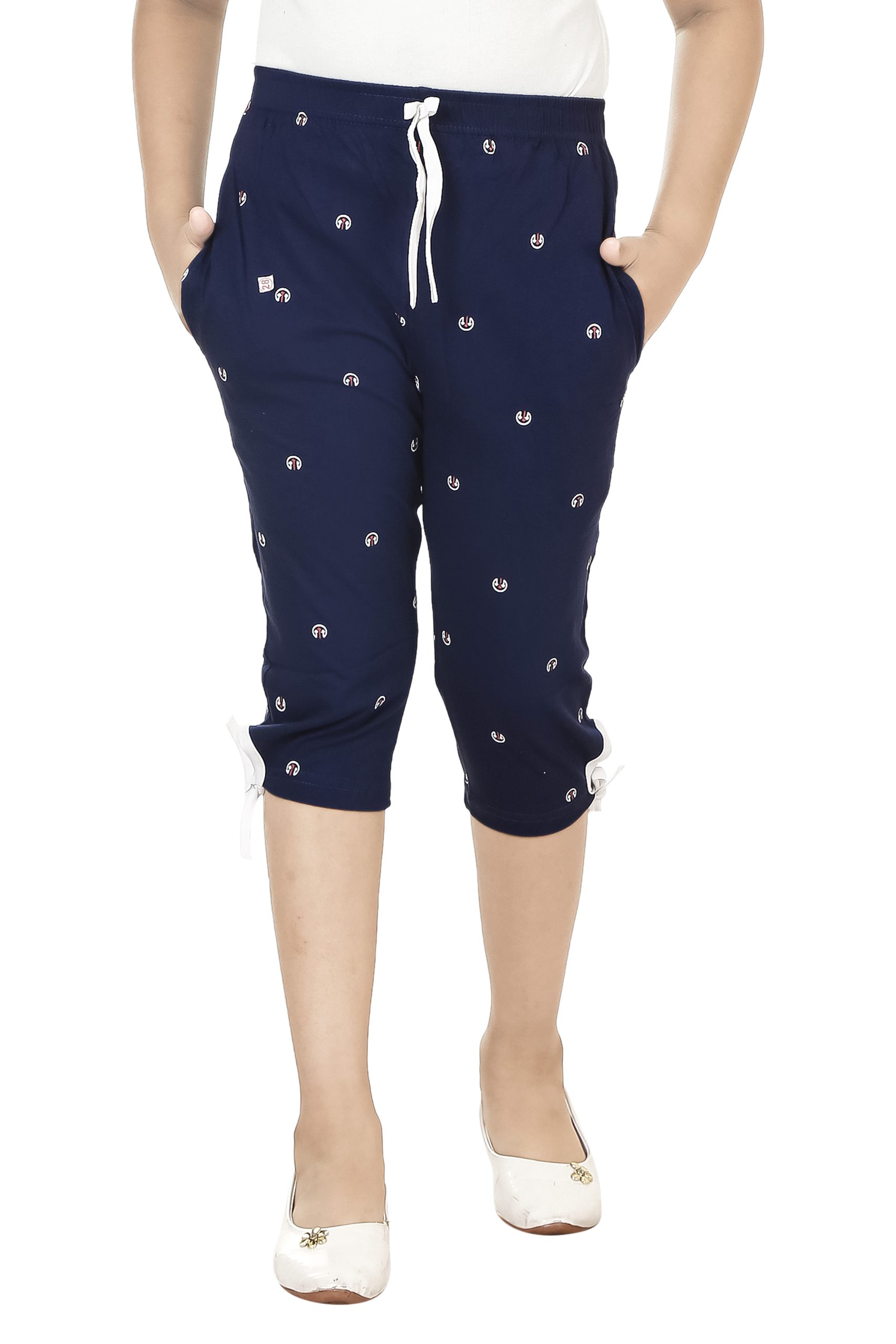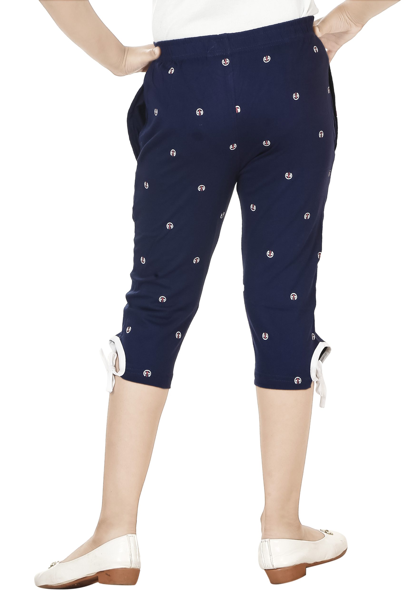 Girl capris made from hosiery cloth are likely to have a snug fit and a sleek appearance, providing a form-fitting silhouette. The hosiery cloth used in these capris is likely to be a stretchy and breathable fabric, providing comfort and flexibility for everyday wear. Capris are shorter than regular pants but longer than shorts, usually ending around mid-calf or just below the knee. This length is characteristic of capris, allowing for a stylish and versatile look.